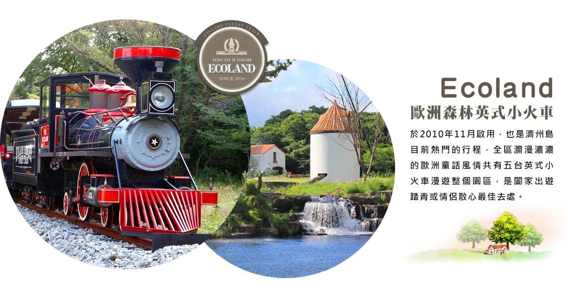 【Ecoland歐洲森林樂園~英式小火車】於2010年11月啟用,也是濟州島目前熱門的行程,全區瀰漫濃濃的歐洲童話風情共有五台英式小火車漫遊整個園區,是闔家出遊踏青或情侶散心最佳去處。