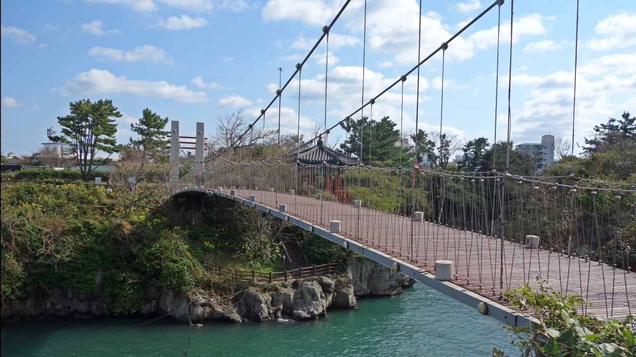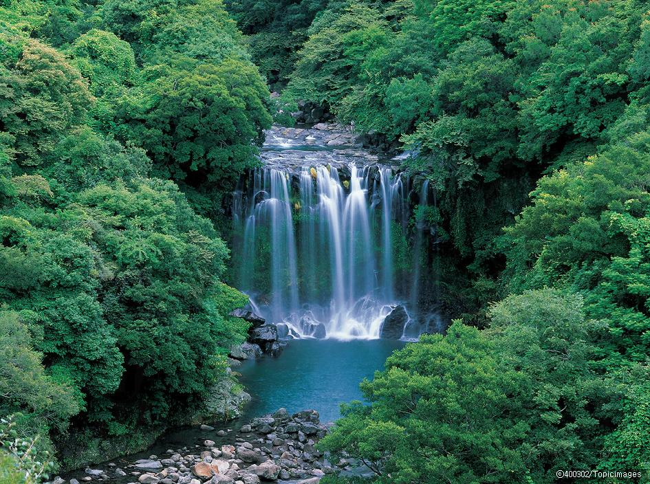 【天帝淵瀑布「仙臨橋、五福泉、天帝樓」】位於如美地植物園下方的天帝淵溪谷上架有一座華麗的仙臨橋,在這座橋上可觀賞濟州島最大的瀑布,是少見的三段式瀑布。第一段和第二段瀑布為同一方向可在近,處外觀看。第三段瀑布位於溪谷下游,必須步行下達深谷底處方可一窺其貌,谷底清幽景色怡人。
