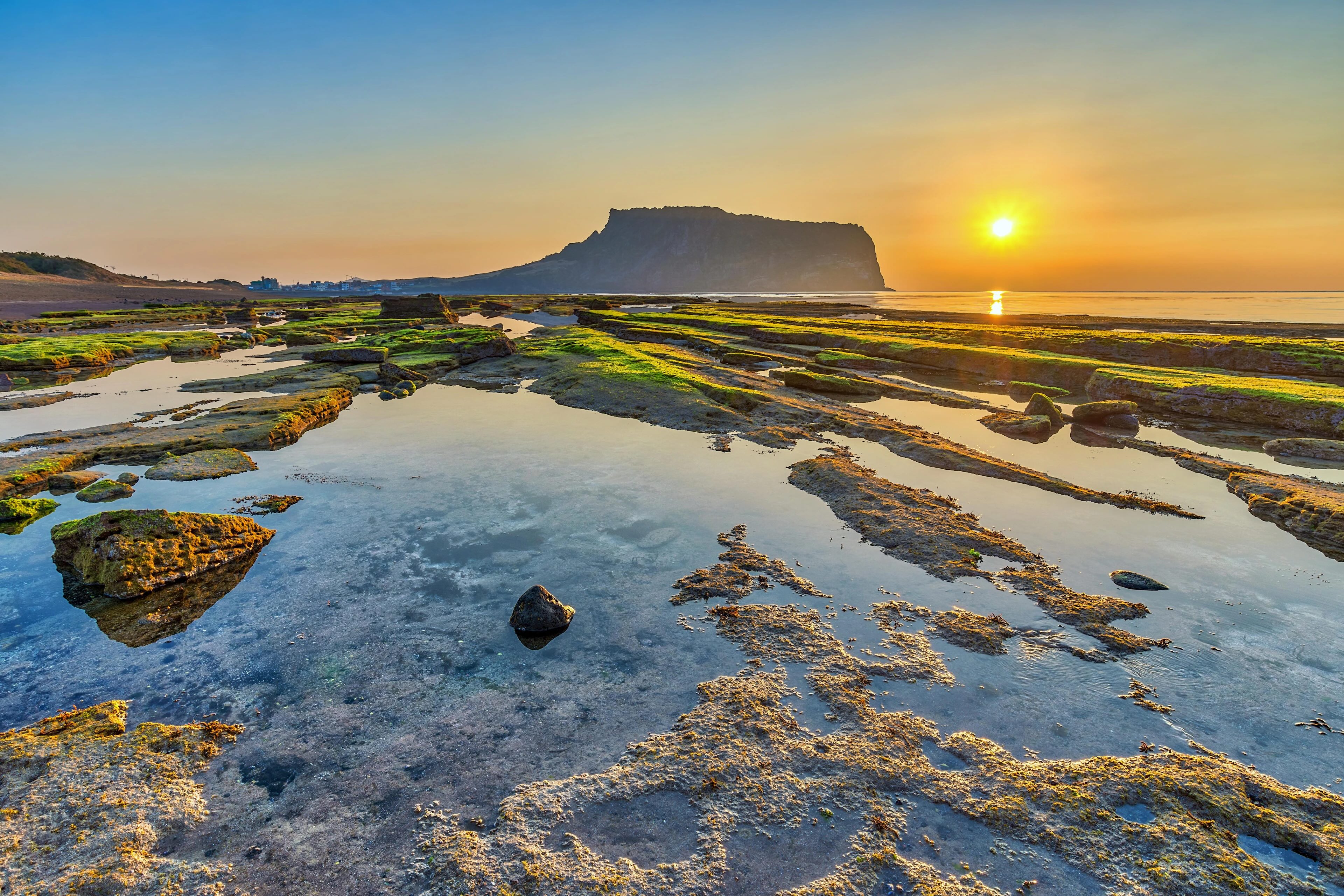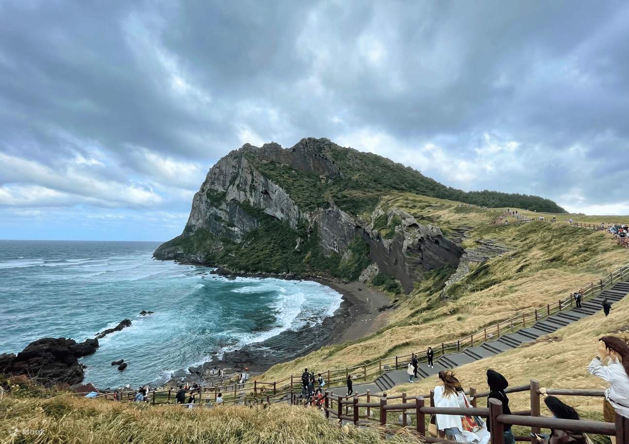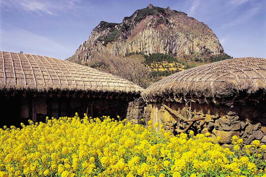 【城山日出峰-世界文化遺產】為漢拏山360個止火焰山之一,也是世界最大的突出於海岸的火山口,攀登30分鐘左右到達山頂;由此也可觀看日落,加上可以瞭望一片廣闊的牧場,美不勝收,令人嘆為觀止,遠眺這山峰綺麗景色。