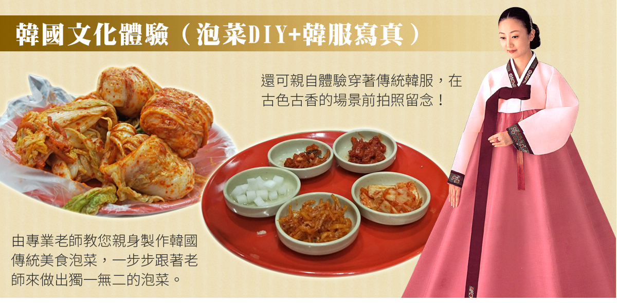 韓國體驗營【學習製作泡菜+韓服攝影】可了解馳名世界的發酵食品泡菜製作過程,另安排親自穿著傳統韓服,韓服的線條兼具曲線與直線之美,您可拿著相機隨意拍攝,留下永恆回憶。