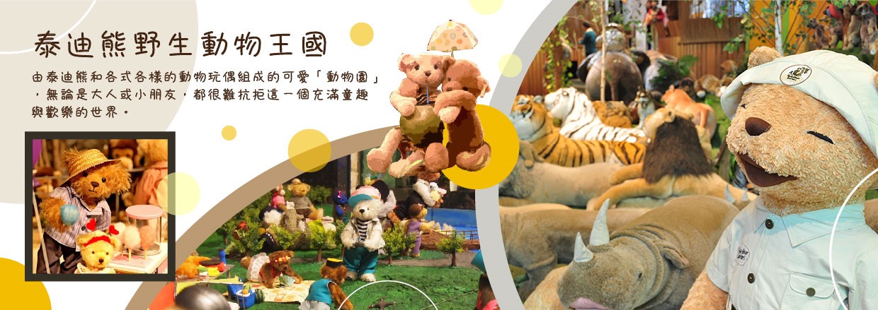 【泰迪熊野生動物王國】 (贈泰迪熊娃娃吊飾一隻) 由泰迪熊和各式各樣的動物玩偶組成的可愛「動物園」,無論是大人或小朋友,都很難抗拒這一個充滿童趣與歡樂的世界。這裡除了許多可愛的泰迪熊之外,還增加了許多可愛的動物,例如:大象、老虎、熊貓、長頸鹿等等,這些可愛的絨毛娃娃共組一個無牢籠的可愛動物園,無論是凶猛的老虎、鱷魚,或是可愛的小綿羊、小白兔,遊客都可以近距離的觸摸和拍照。除了展示區之外,另有販賣部專售各種泰迪熊的玩偶和紀念品,令人愛不釋手。
