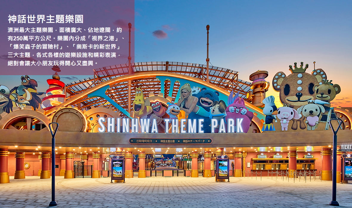 神話主題樂園:與著名動漫公司TUBAn共同打造包括奧斯卡的新世界、逗逗蟲的冒險村、視界之港、旋轉公園等,3大區塊足以讓人玩樂沉浸於童趣歡樂的世界中。離開現實世界,踏上想像國度之旅。主題公園總面積約