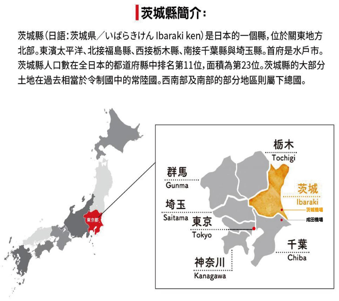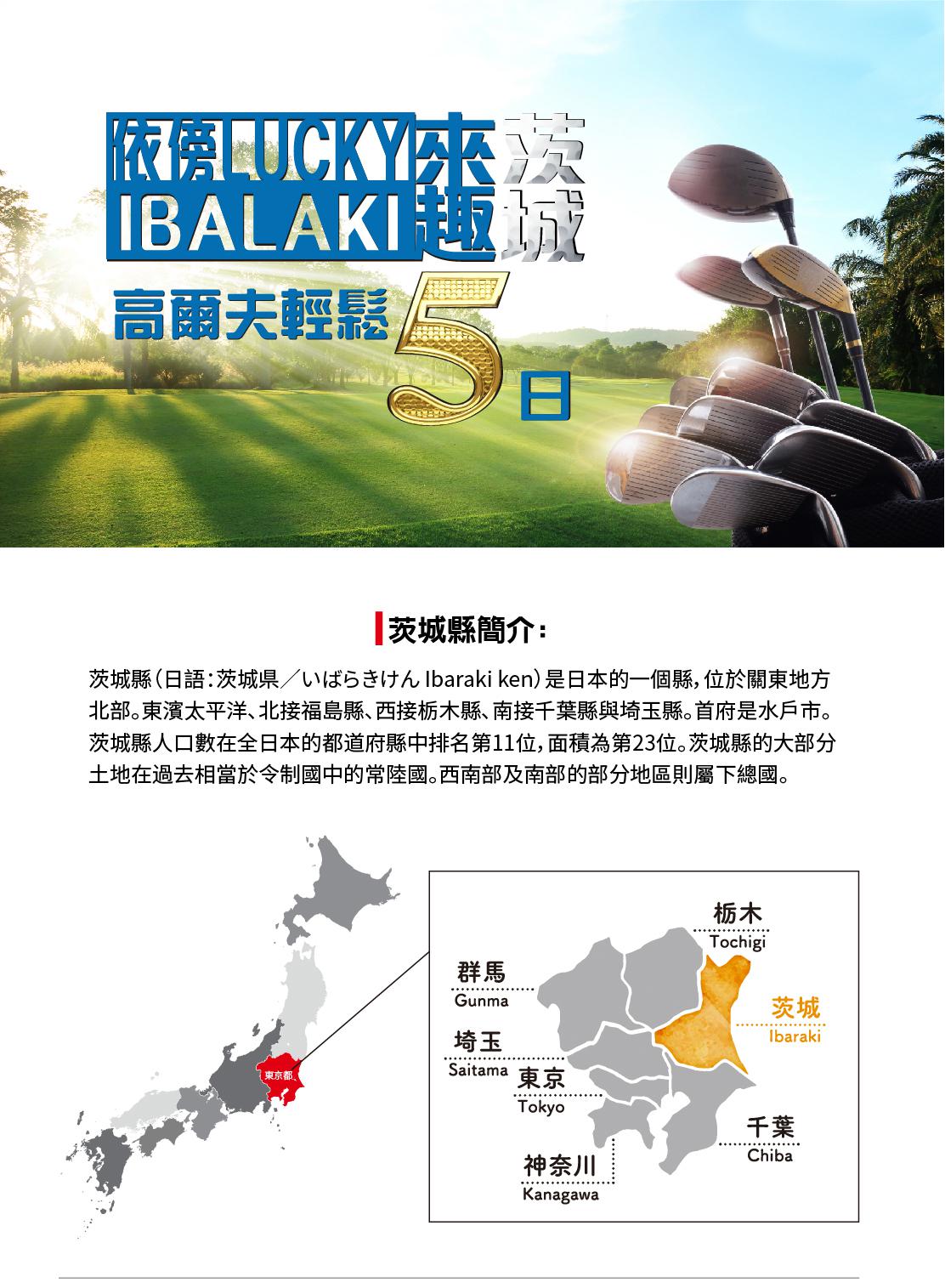 茨城位於本州關東地方北部,首府水戶市,距首都東京約 40 公里,屬於溫暖宜人的太平洋沿岸氣候,擁有豐富的大自然、食品工業、溫泉,以及多樣化的慶典活動。由於臨近日本第一大消費市場東京,茨城縣的農業和漁業都很發達。縣的北部有列爲日本三大名瀑之一的袋田瀑布等名勝。19 世紀由當時的領主德川齊昭下令建造的偕樂園被譽爲日本三大名園,頗有名聲。日本茨城現有125座球場,精選周遭的一些優質球場讓您輕鬆打球.