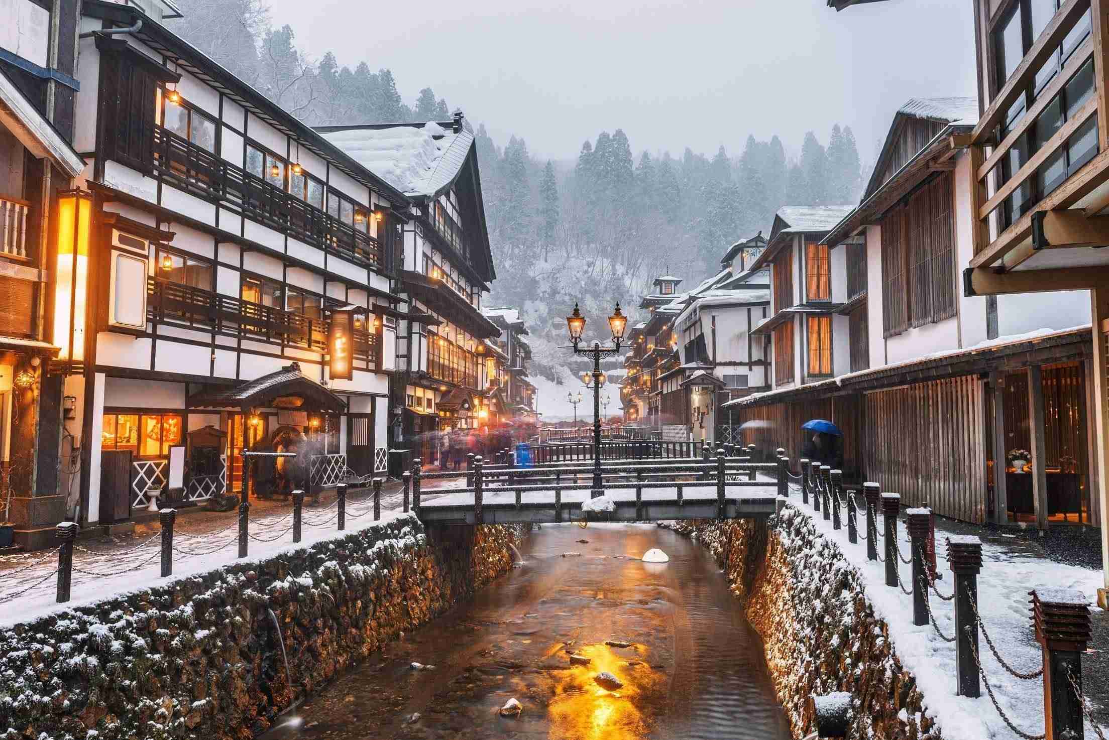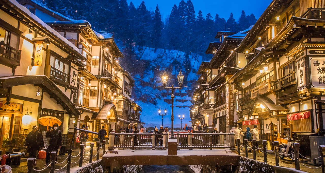 銀山最有名的就是溫泉啦~因此在銀山溫泉街上,你能看到許多超漂亮的銀山溫泉飯店,都分別坐落在銀山川的兩側。古樸懷舊的日式建築加上皚皚白雪及小溪,真的非常美,可說是此生必來的景點啊!