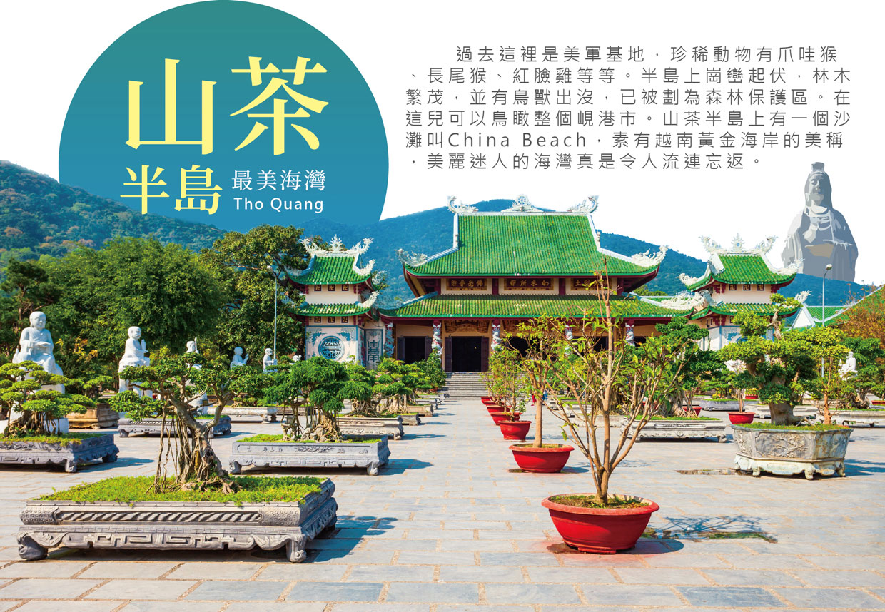 山茶半島_靈應寺:坐落峴港灣東側的山茶半島靈應寺,終年香火鼎盛,背靠青山面臨東越南海,視野開闊能俯瞰對岸峴港市高樓大廈及美溪海灘
