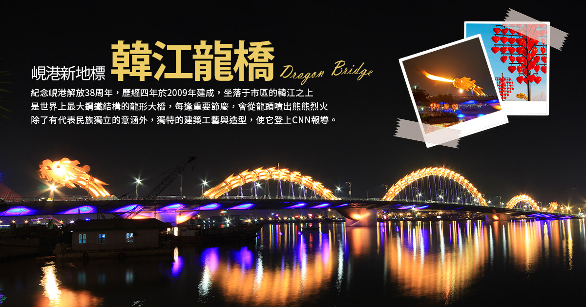 龍橋是峴港的地標之一,全長666公尺,造型如巨龍橫跨漢江。夜晚時分,橋身燈光璀璨,龍頭更會在週末夜晚噴火與噴水,場面壯觀,吸引眾多遊客駐足觀賞。龍橋不僅是交通要道,更是峴港現代化與創意的象徵。