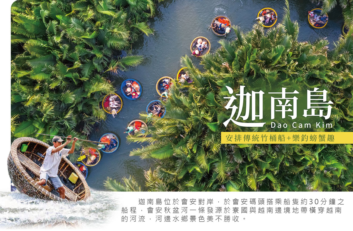 迦南島位於會安古鎮旁,環境清幽,河道縱橫。島上以椰林水鄉聞名,遊客可乘坐小船穿梭於椰林間,體驗純樸的漁村生活。這裡也是品嚐會安特色美食的好地方,如迦南島的米餅與海鮮料理,展現濃厚的地方風味。