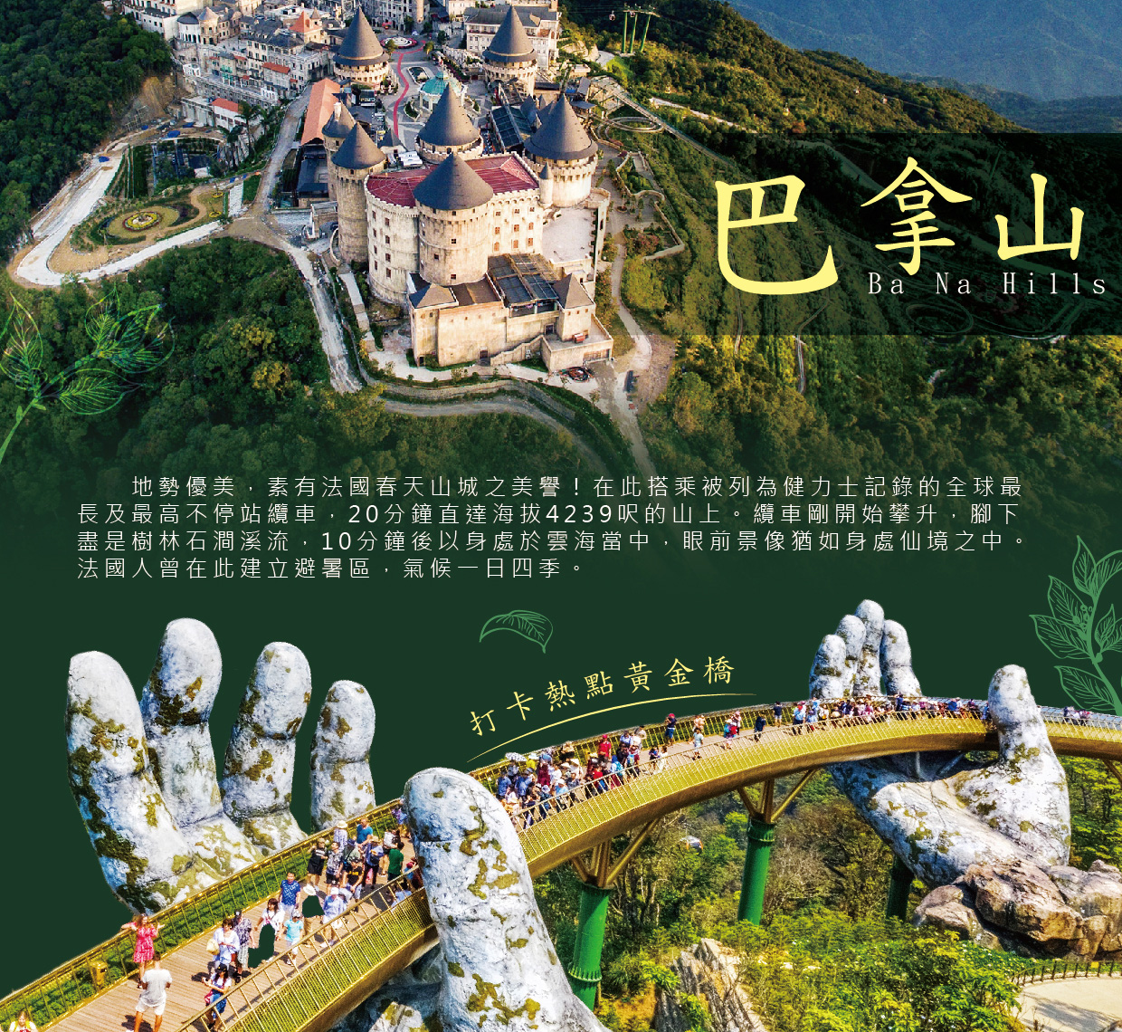巴拿山是越南峴港附近一處受法國殖民時期啟發而建的旅遊景點,以其世界級的纜車、法式建築風格的「法國村」,以及知名的佛手金橋而聞名。該度假區結合了主題樂園和飯店,成為一個集觀光、娛樂和度假於一身的綜合性景點,讓遊客可以在一天內體驗到多種風情與設施。