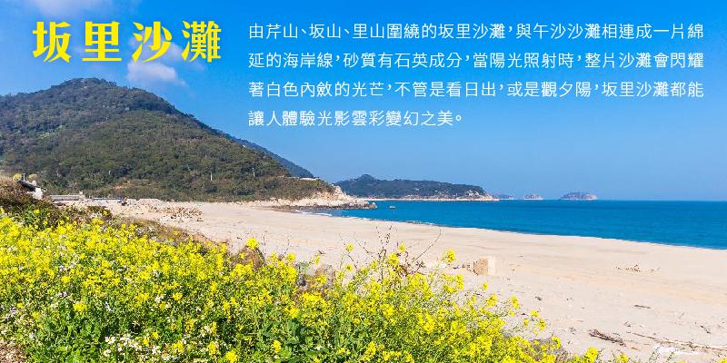 ◆坂里沙灘:平直的海岸,細軟的沙灘,對於多岩灘的馬祖而言,坂里的一片白色沙灘特別顯得珍貴。由芹山、坂山、里山圍繞的坂里沙灘,與午沙沙灘相連成一片綿延的海岸線,砂質有石英成分,當陽光照射時,整片沙灘會閃耀著白色內斂的光芒,不管是看日出,或是觀夕陽,坂里沙灘都能讓人體驗光影雲彩變幻之美。 往白沙港方向不遠處,可見一座小巧多彩的天后宮,就建在沙灘上,廟宇雕塑亦值得一看。