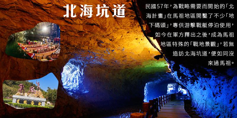 ◆北海坑道:民國57年,為戰略需要而開始的「北海計畫」在馬祖地區開鑿了不少「地下碼頭」,專供游擊戰艇停泊使用,如今在軍方釋出之後,成為馬祖地區特殊的「戰地景觀」,若無造訪北海坑道,便如同沒來過馬祖。北海坑道位處鐵板海岸線,為一深入山腹,貫穿岩壁,呈「井」字形交錯的水道;水道高18公尺,寬10公尺,長640公尺,漲潮時水位達8公尺,退潮時為4公尺,步道全長700公尺,走完一圈約需30分鐘,但要配合潮汐的漲退,在退潮時才能進入。(行程配合潮汐做前後調整)