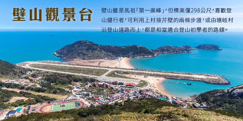 ◆壁山觀景台:壁山雖是馬祖「第一高峰」,但標高僅298公尺,喜歡登山健行者,可利用上村接芹壁的兩條步道,或由塘岐村沿登山道路而上,都是相當適合登山初學者的路線。 壁山山腰處有觀景台,遊客可憑欄眺望,視野相當開闊,北竿機場、塘岐、后沃盡收眼底,還能一覽北竿周邊的無人島嶼,如大坵、小坵等。