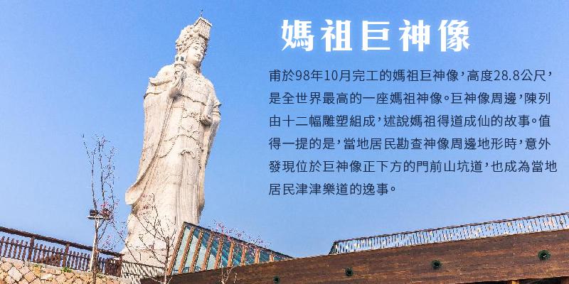 ◆媽祖巨神像:甫於98年10月完工的媽祖巨神像,高度28.8公尺,是全世界最高的一座媽祖神像。媽祖巨神像的興建,更代表馬祖人民對於媽祖信仰的虔誠,這座神像從提案到正式落成,花了十年以上的時間,可見馬祖居民的決心。巨神像周邊,陳列由十二幅雕塑組成,述說媽祖得道成仙的故事。值得一提的是,當地居民勘查神像周邊地形時,意外發現位於巨神像正下方的門前山坑道,也成為當地居民津津樂道的逸事。