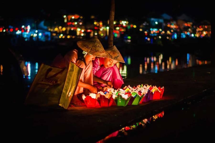 秋盆河(Thu Bon River)孕育會安城的興盛,從夕陽到夜晚散發不同風情,有許多小販會在河岸旁兜售水燈和搭人力扁舟遊河。特別安排貴賓體驗放水燈,放水燈前許下心願讓水燈搭載上心願一起搖曳在秋盆河中,好不浪漫!