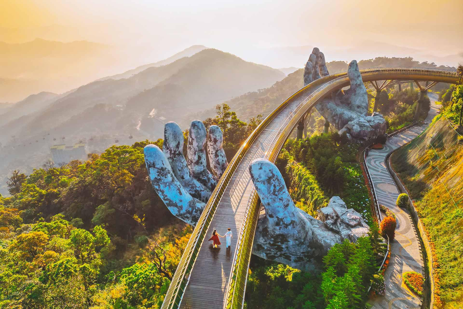 海拔 1,414 公尺處,約 150 公尺長的金色環形步道,被兩隻石雕大手托著,這樣的奇幻景致被《TIME》評為「2018年世界最佳 10 個旅遊地點」,多數遊客也是為一睹奇景將峴港列為必遊名單。